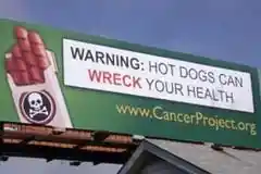 На биллборде нарисована сигаретная пачка с костями и черепом, из которой торчат жареные сосиски. Изображение сопровождается надписью «С опаской: хот-доги смогут причинить вред вашему здоровью».